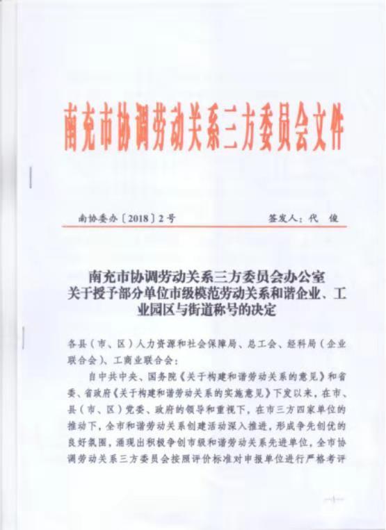 南充浩宇勞務(wù)被授予南充市模范企業(yè)